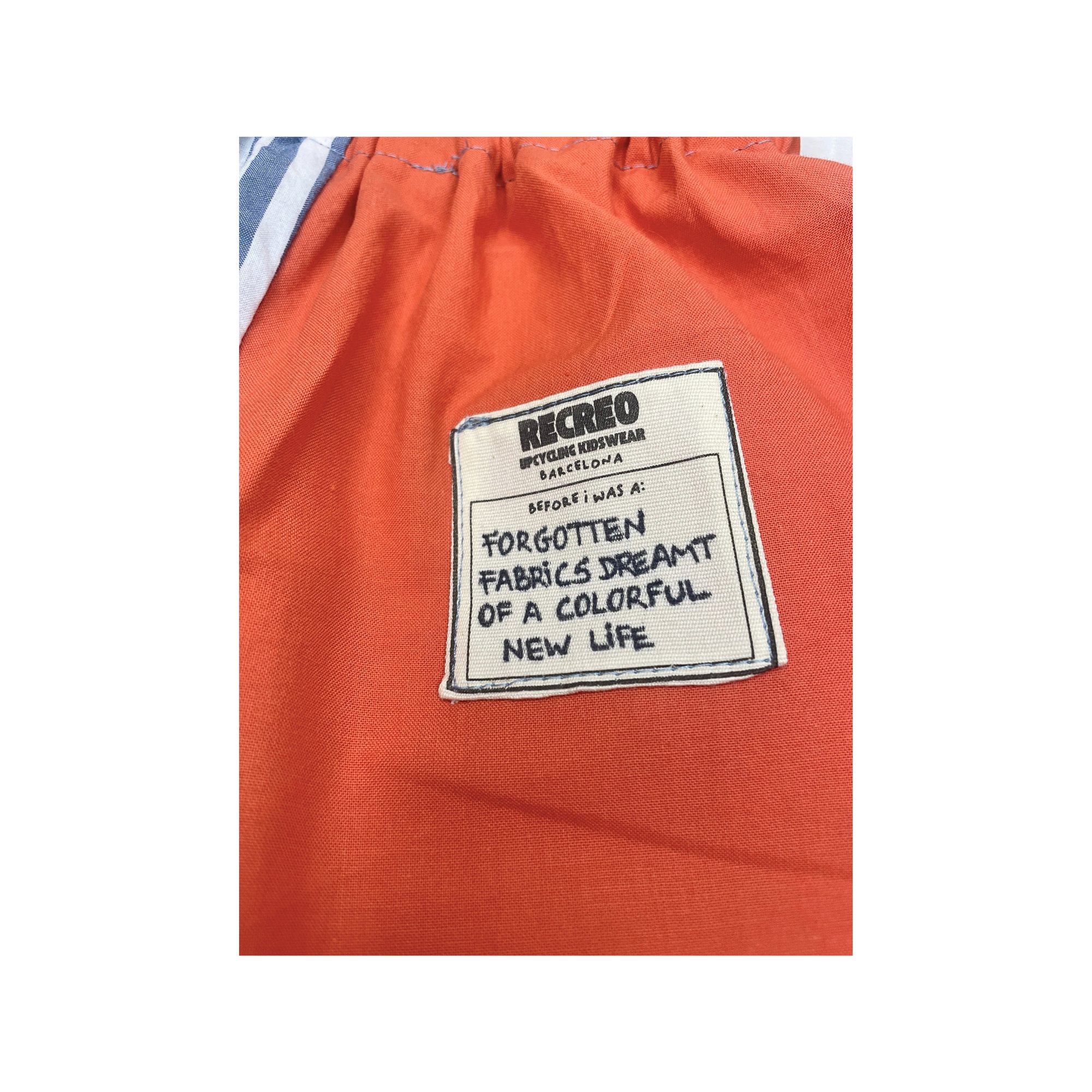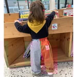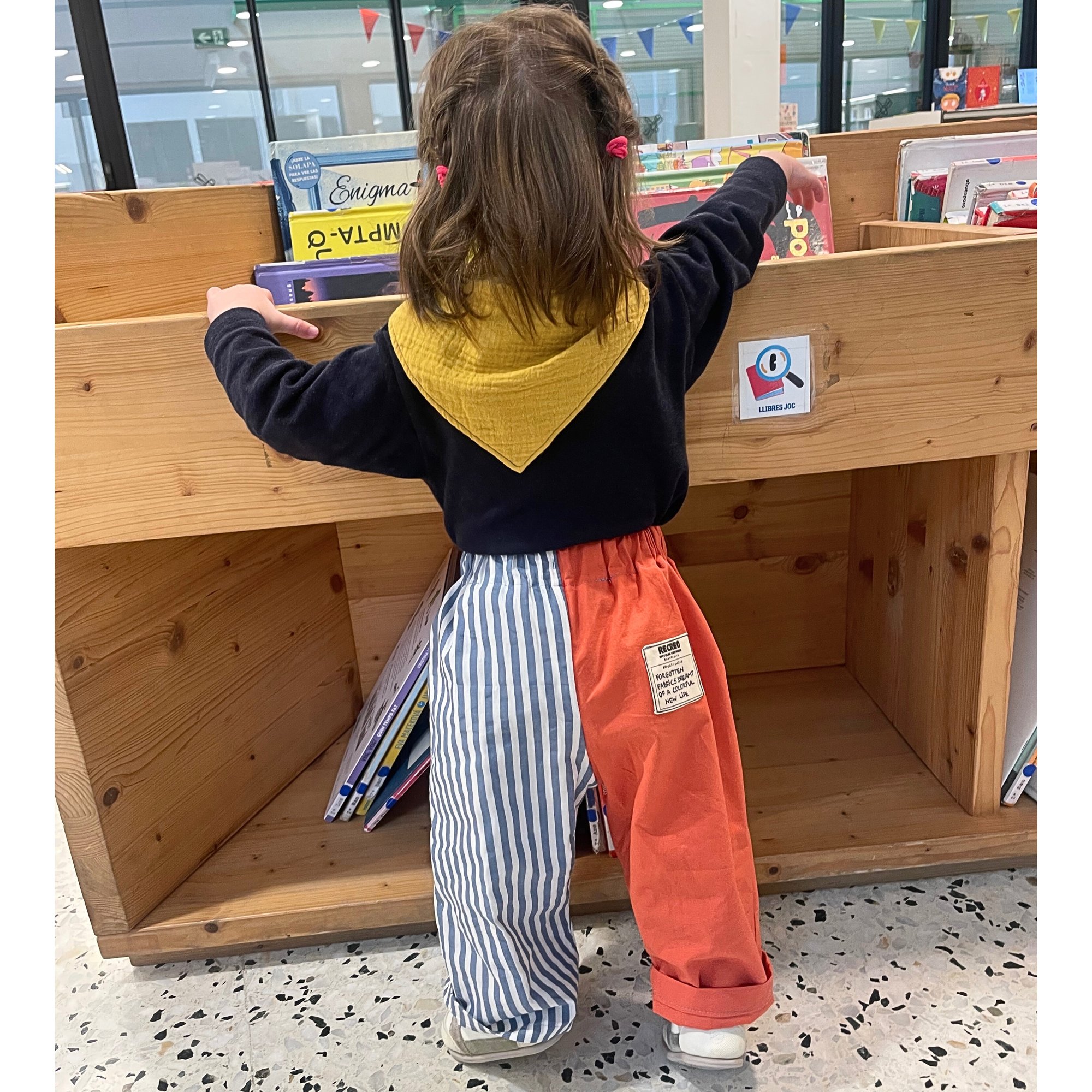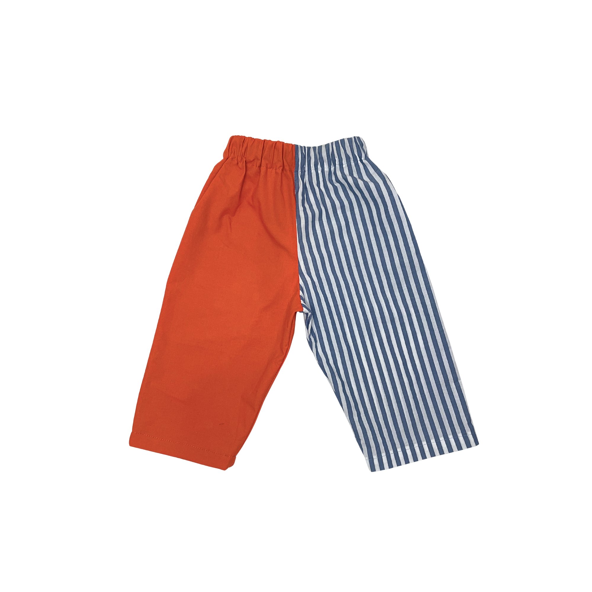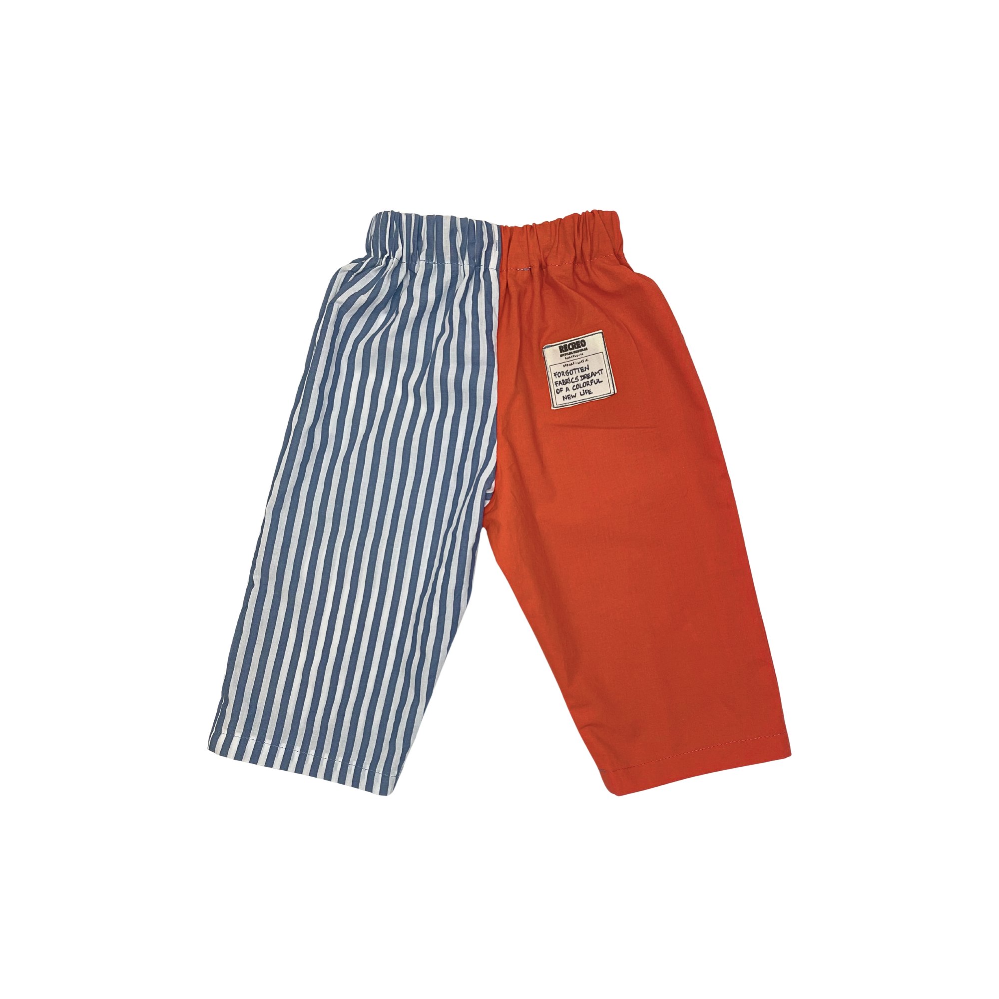 Este pantalón infantil es un diseño upcycled, confeccionado a mano a partir de telas nuevas y recuperadas, en este caso: sobrantes de stock.