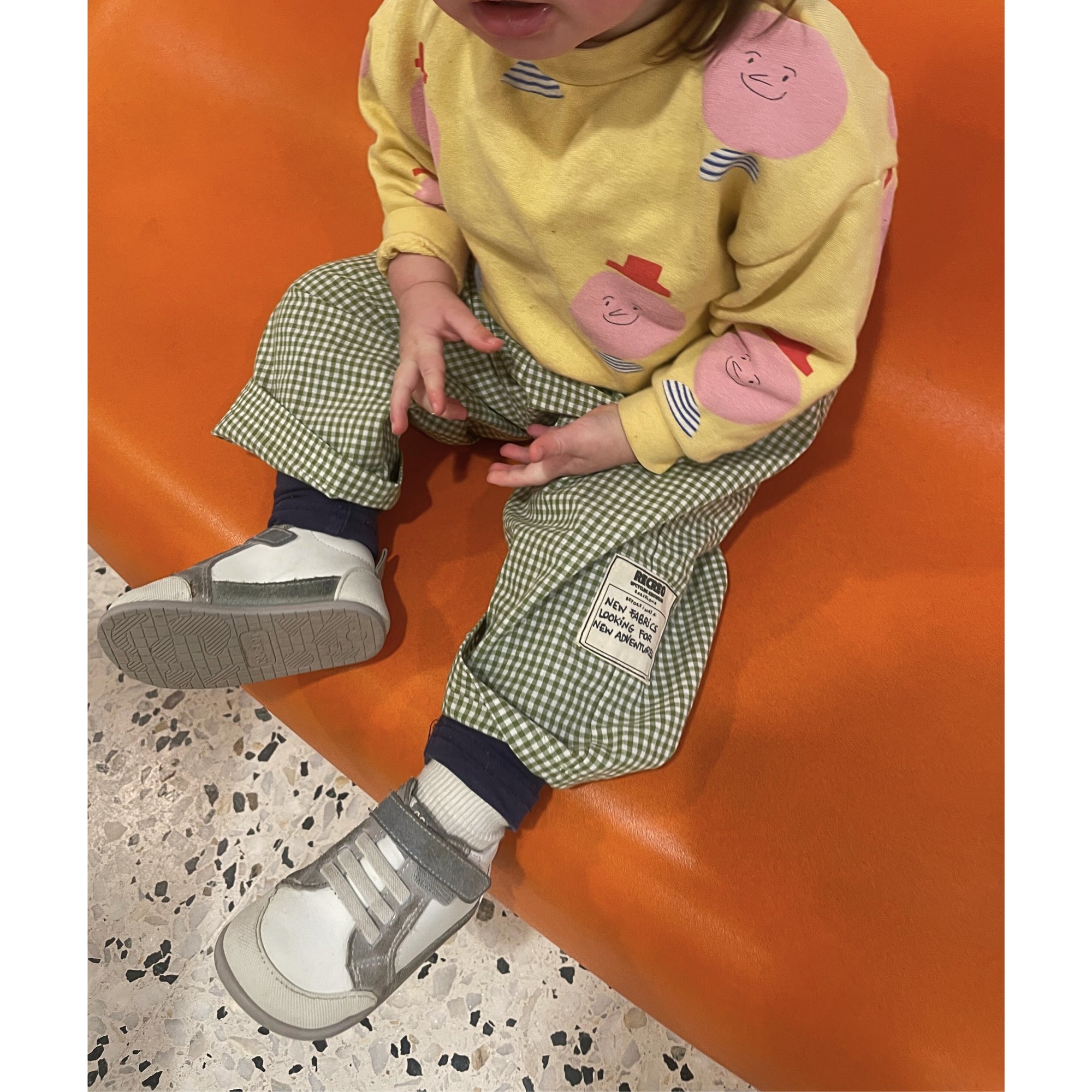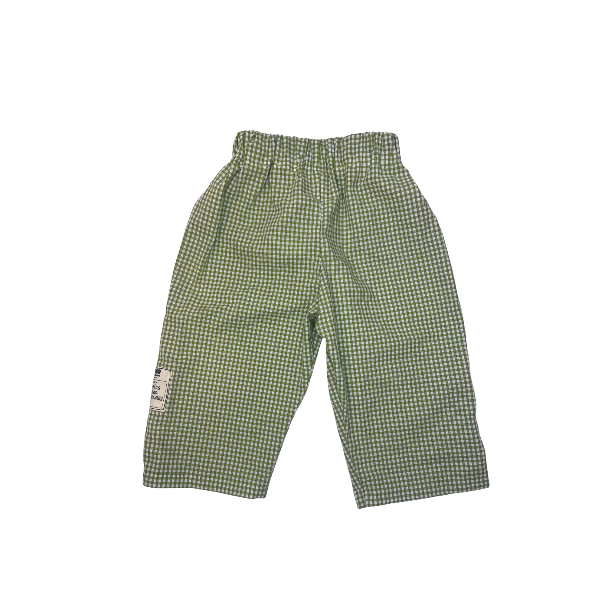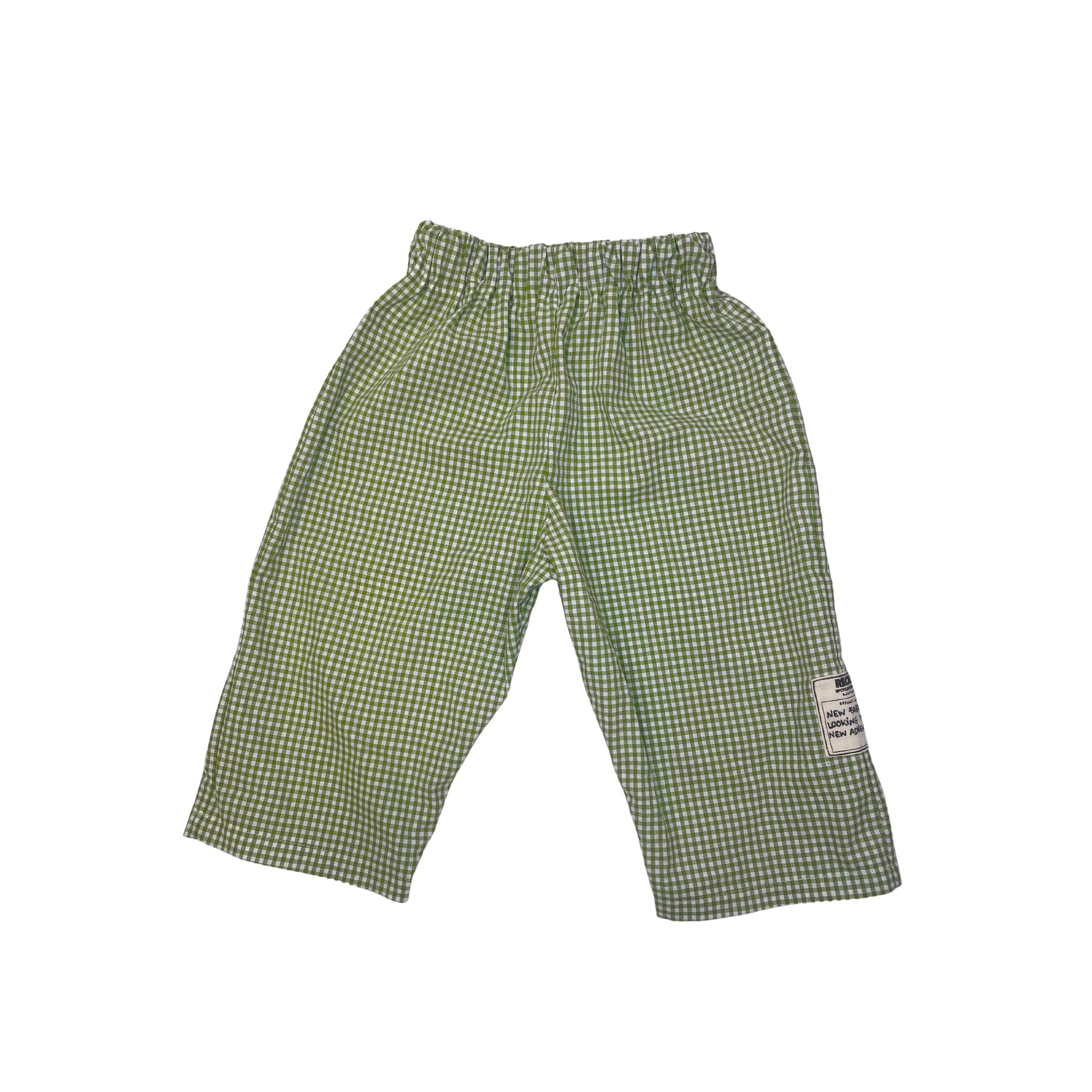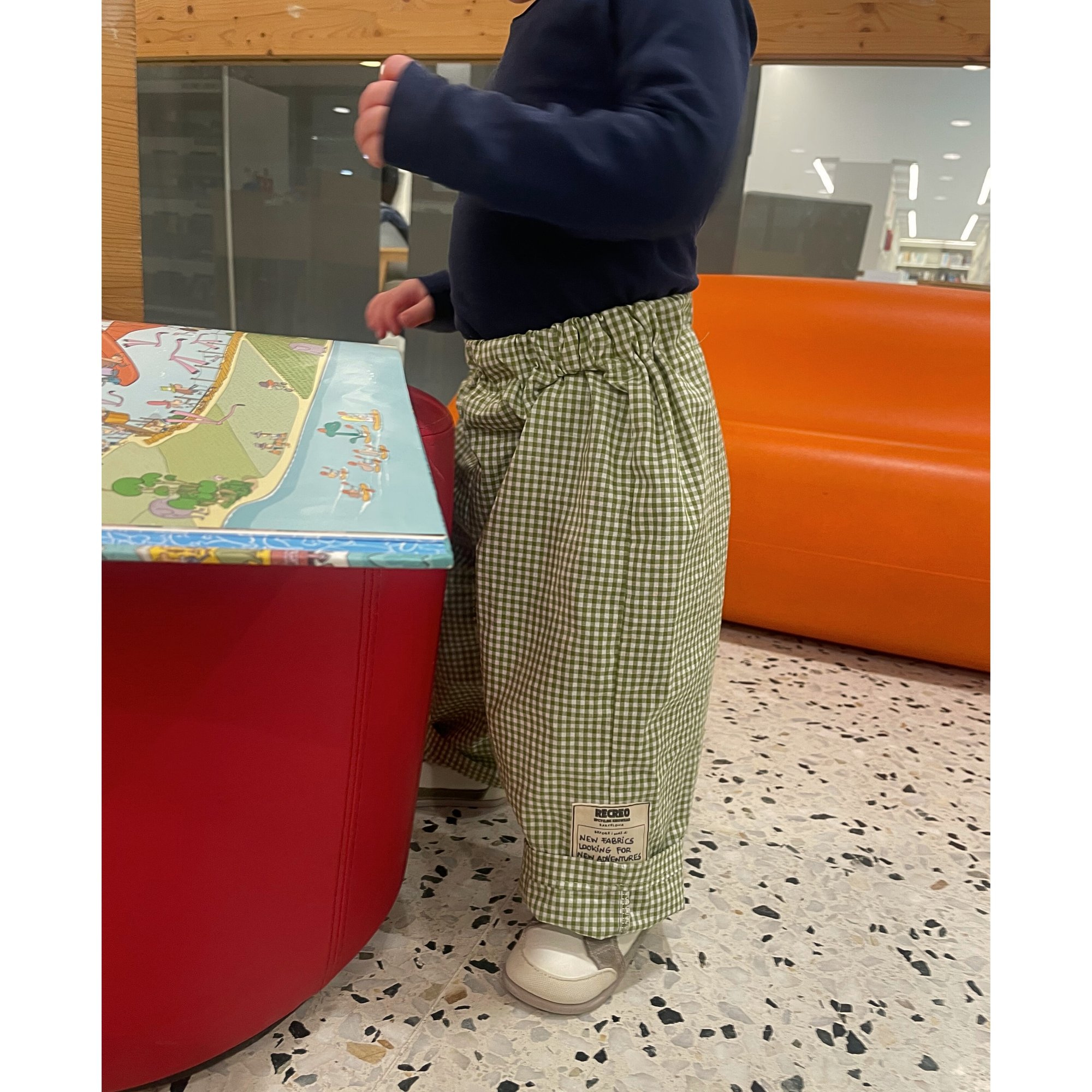 Este pantalón infantil es un diseño confeccionado a mano a partir de telas nuevas y recuperadas.