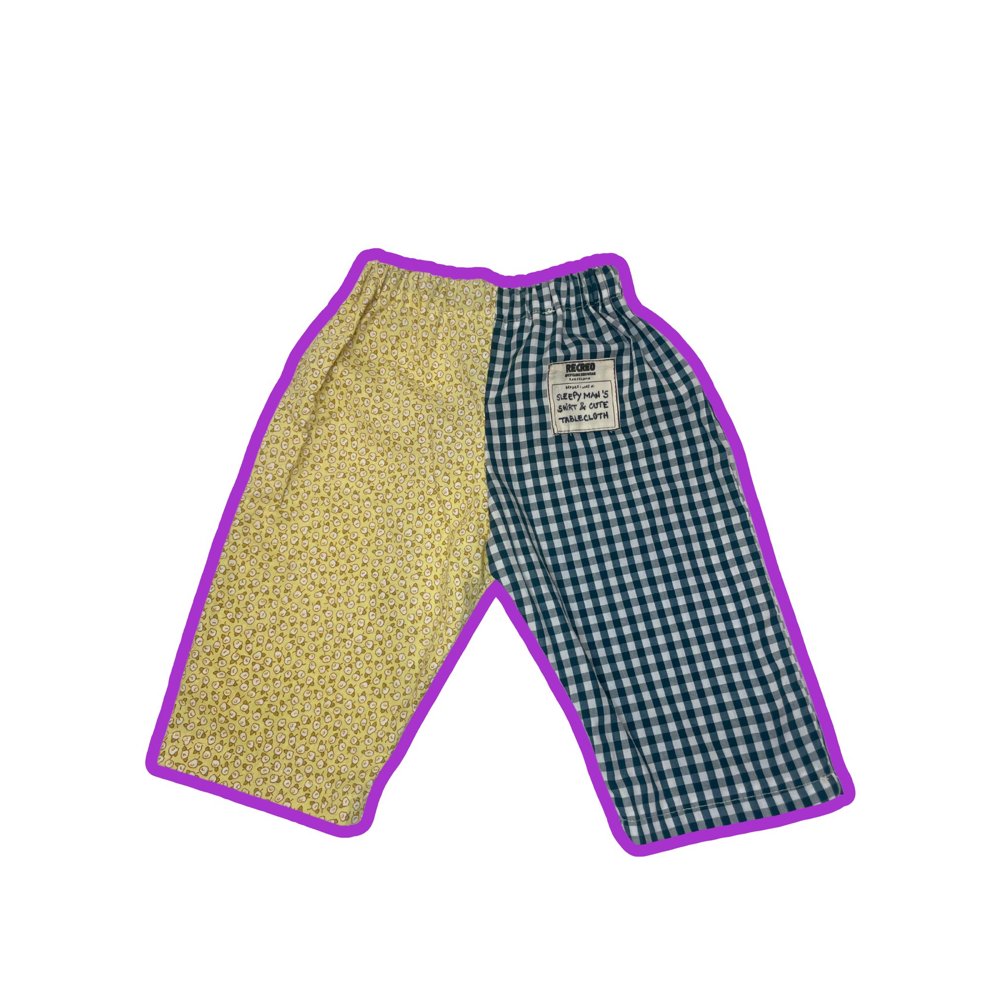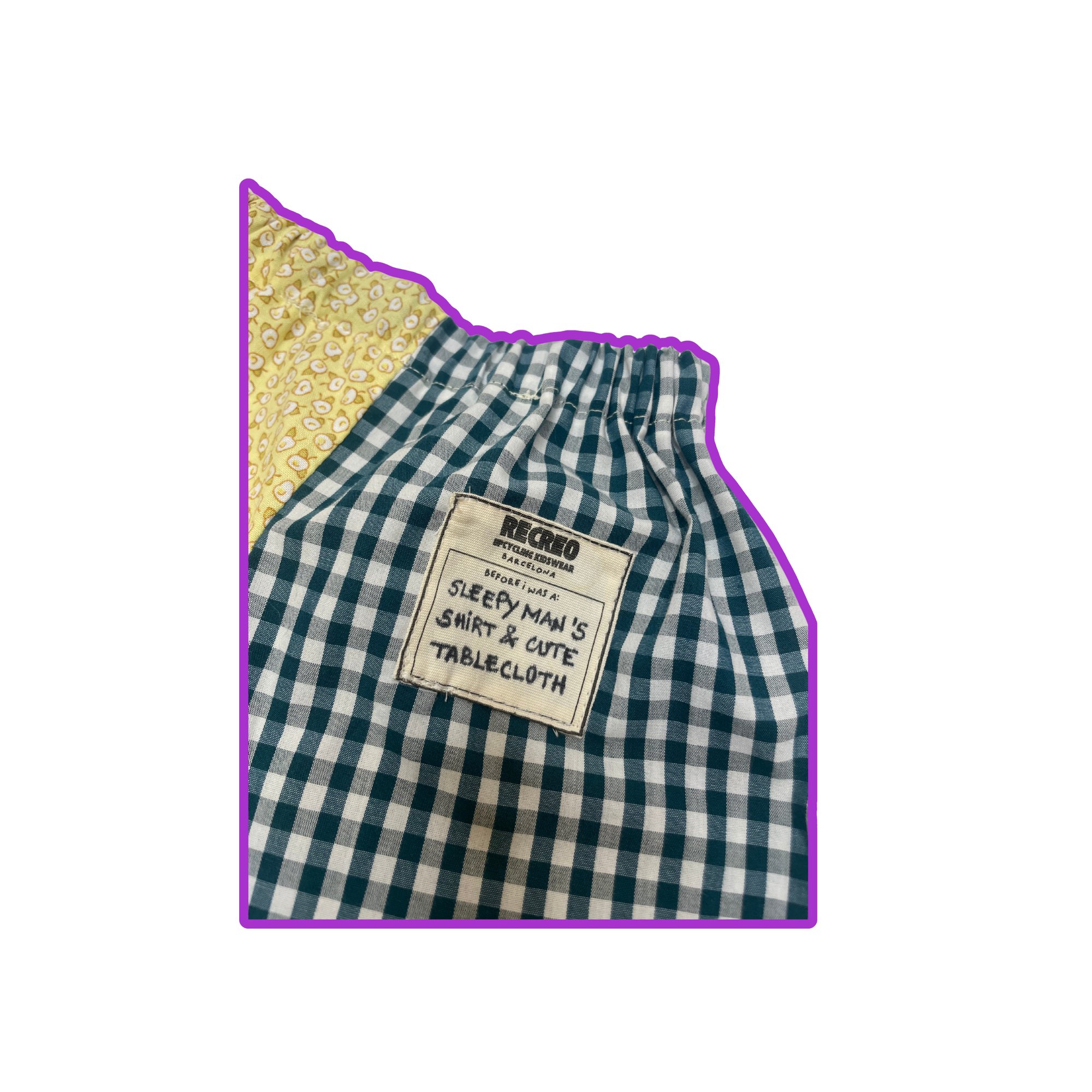 Este pantalón infantil es un diseño 100% upcycled, confeccionado a mano a partir de prendas recuperadas, en este caso: un mantel y una camisa. Con esta metodología no solo reducimos el impacto ambiental, sino que creamos una pieza que es, literalmente, irrepetible. Única y pensada para el libre movimiento.