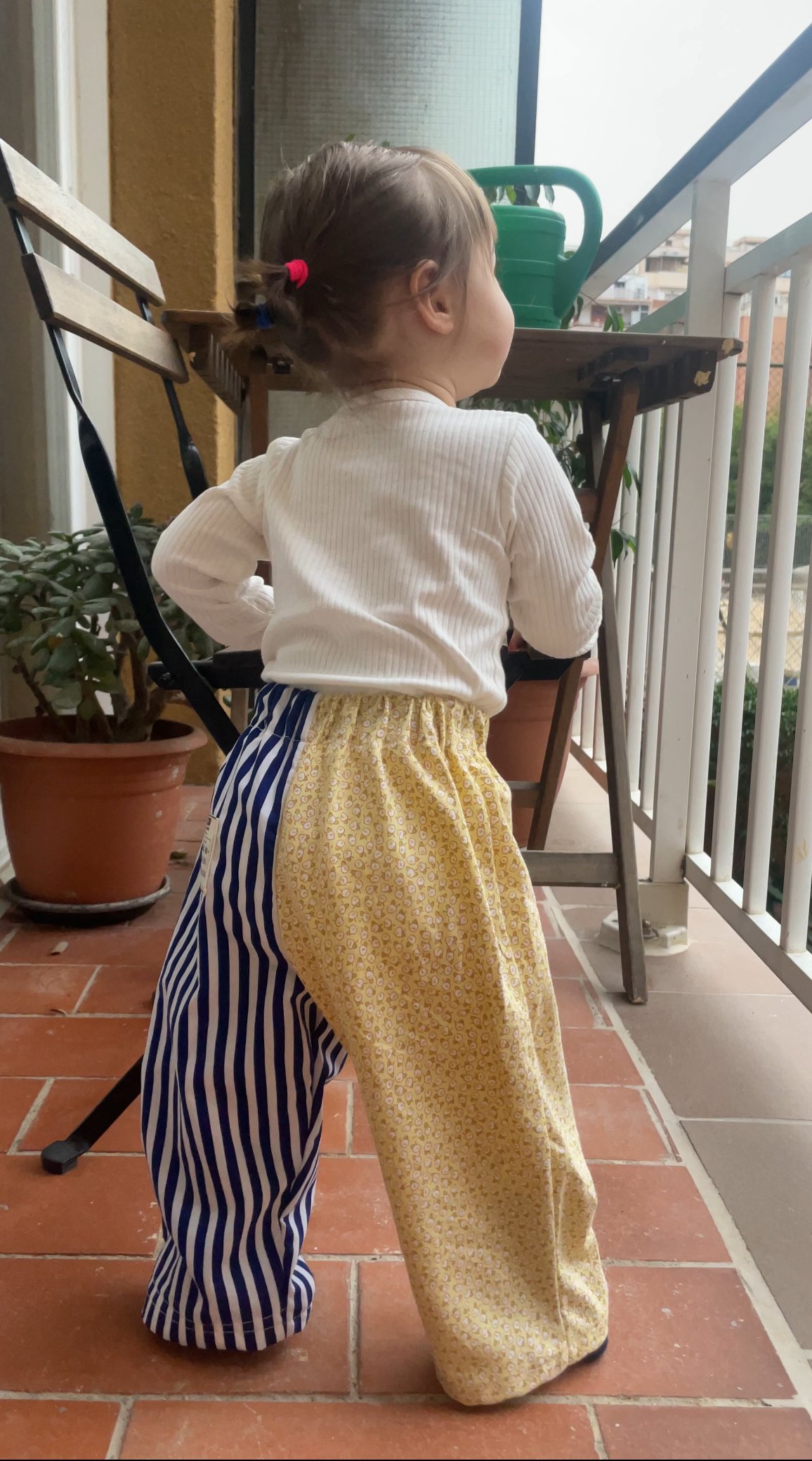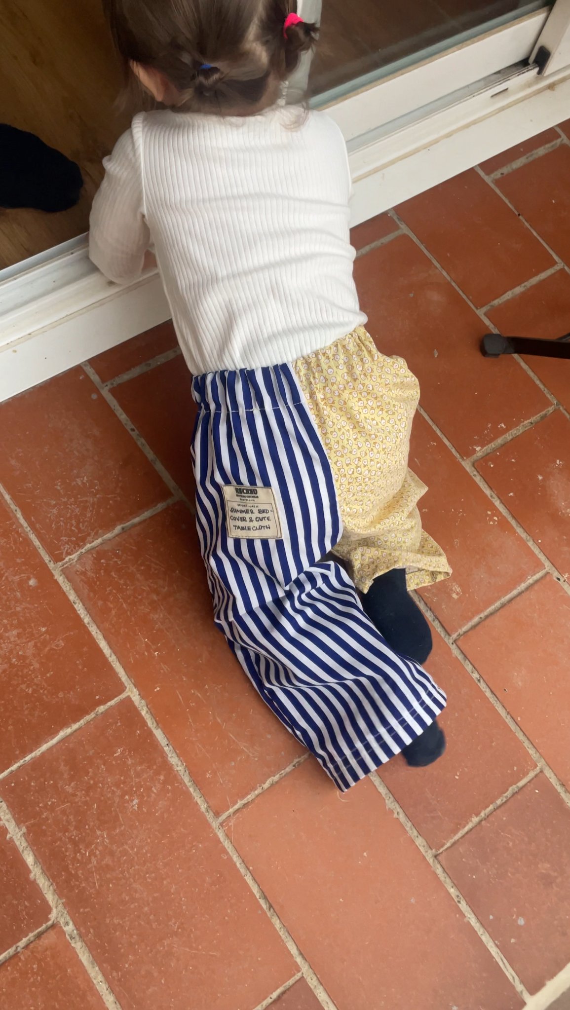 Este pantalón infantil es un diseño 100% upcycled, confeccionado a mano a partir de prendas recuperadas, en este caso: un mantel y un cubre cama. Con esta metodología no solo reducimos el impacto ambiental, sino que creamos una pieza que es, literalmente, irrepetible. Única y pensada para el libre movimiento.